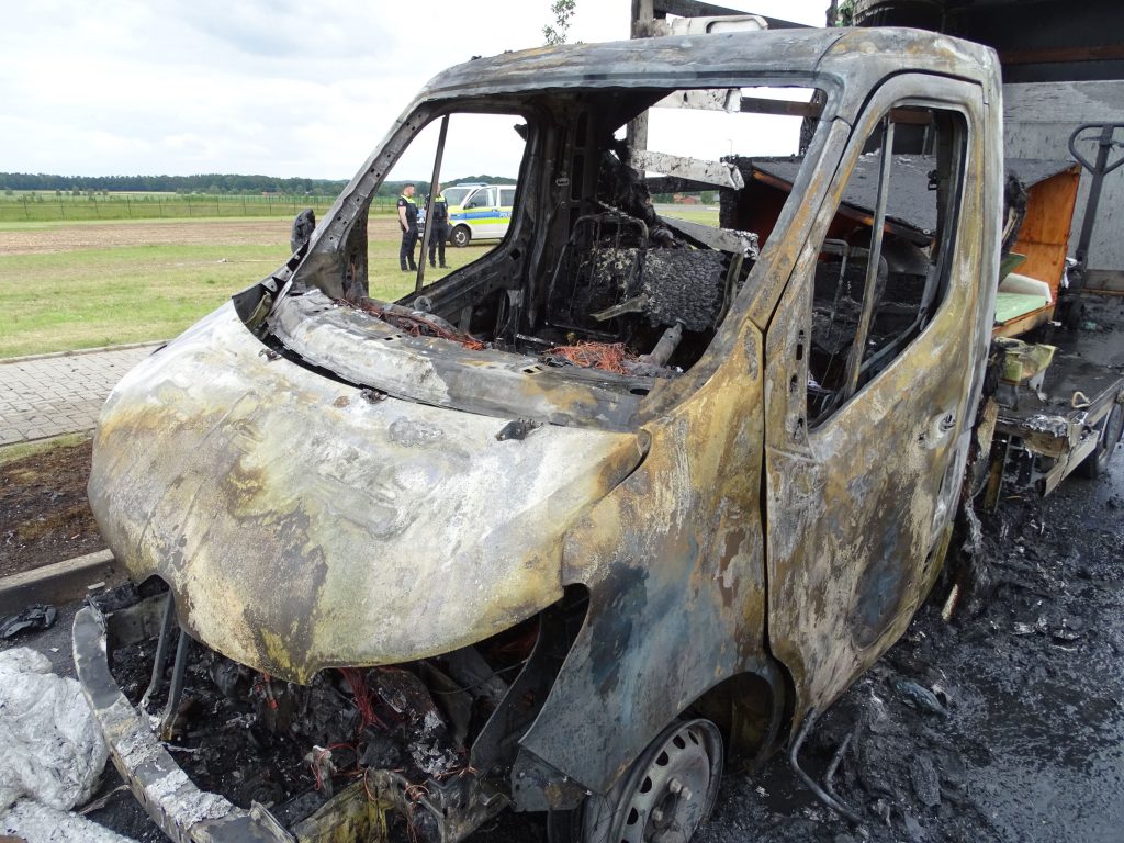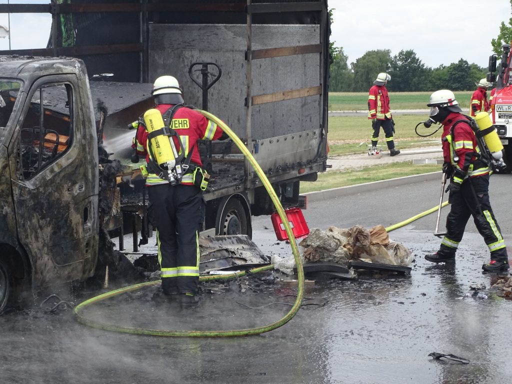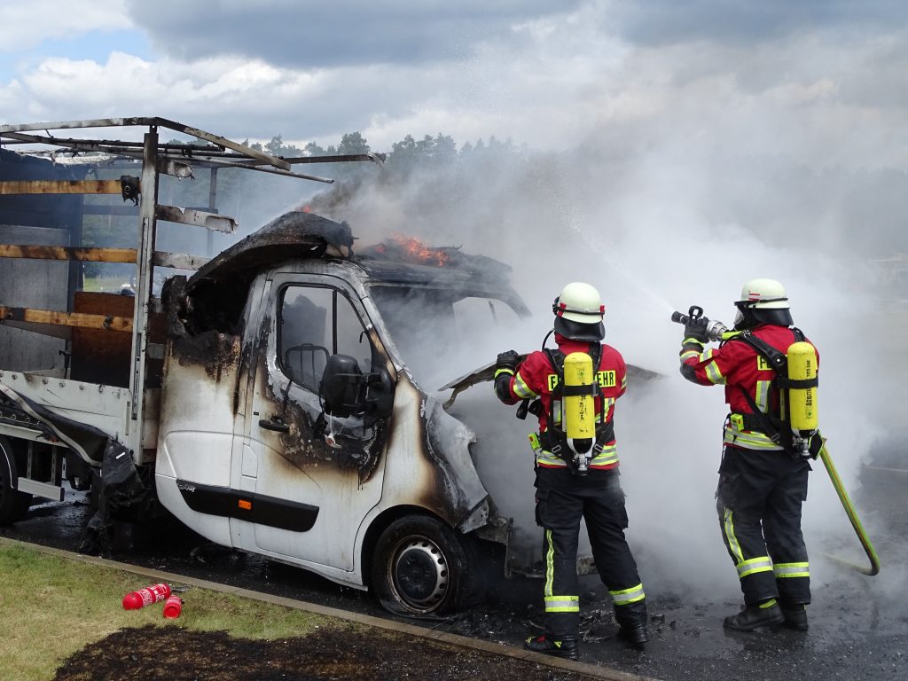 Zunächst versuchte ervergeblich den Brand mit Feuerlöschern selbst zu ersticken. Beim Eintreffen der Einsatzkräfte stand der mit Flugzeugteilen beladene 3,5 Tonner bereits im Vollbrand. Unter Atemschutz ging ein Trupp mit einem Strahlrohr zur Brandbekämpfung vor. Der LKW konnte schnell abgelöscht werden. Der Löscherfolg wurde mit einer Wärmebildkamera kontrolliert. Ausgelaufene Betriebsstoffe und Löschmittel waren in ein Regenrückhaltebecken gelangt. Eine Fachfirma wurde mit der Beseitigung der Rückstände beauftragt. Zur Schadenshöhe und zur genauen Brandursache kann die Feuerwehr keine Angaben machen.